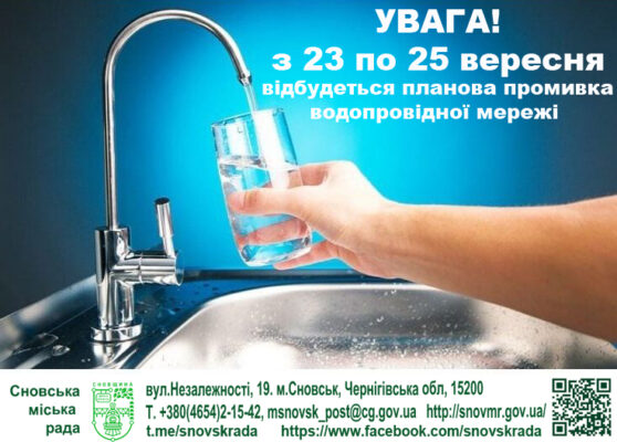 У відповідності до Плану підготовки водопровідного господарства м. Сновськ до роботи в осінньо-зимовий період 2025/2026 років з 23 по 25 вересня (включно) 2025 року буде проводитись дезінфекція та промивання водопровідної системи міста та споруд на ній. У зв’язку з цим, на окремих ділянках системи можливі перебої з водопостачанням, наявність запаху залишкового хлору у воді та осаду.