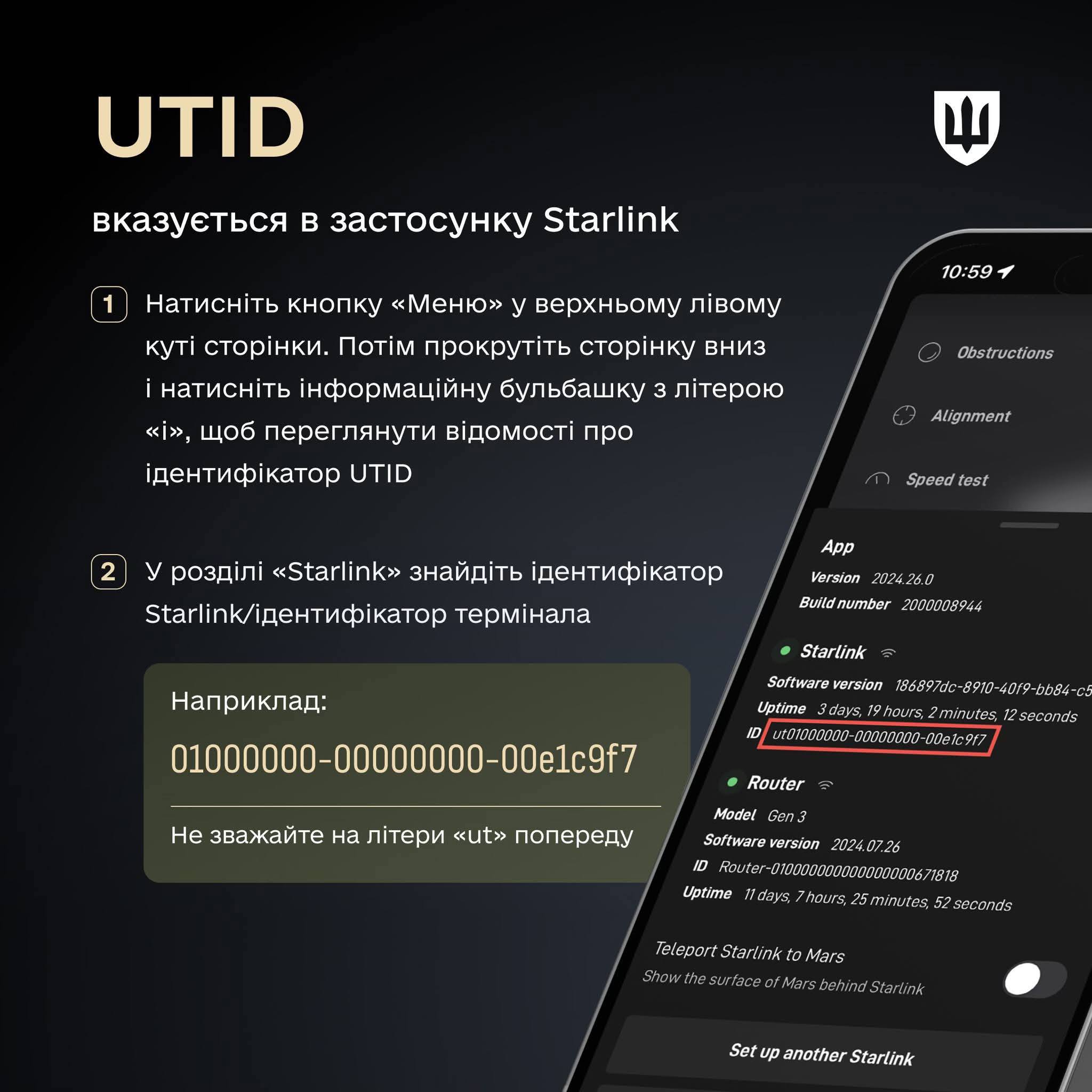 Підготуйте технічні дані: KIT-номер (на коробці) та/або UTID/Dish ID (у налаштуваннях додатка чи акаунту). Також знадобиться номер вашого облікового запису Starlink.
