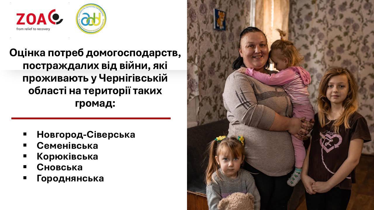 Міжнародна гуманітарна організація ZOA спільно з ГО “Асоціація демократичного розвитку” проводять оцінку потреб домогосподарств у таких громадах Чернігівської області: