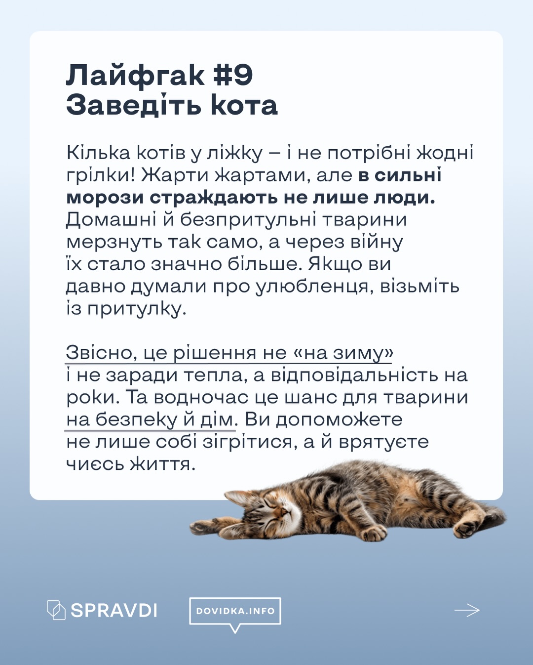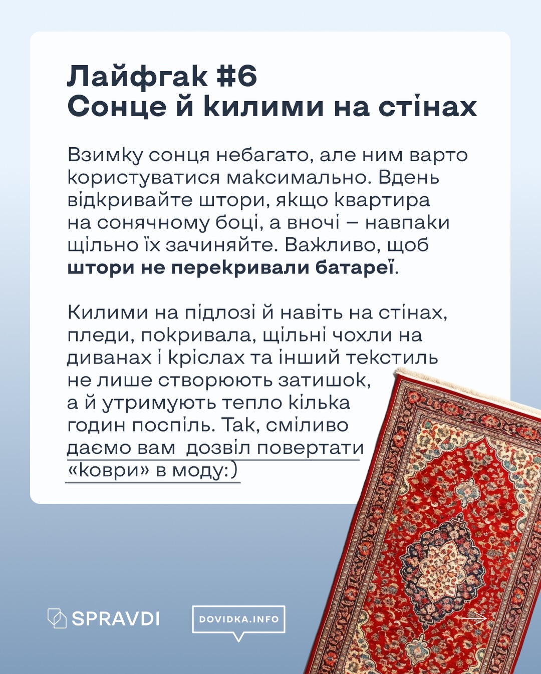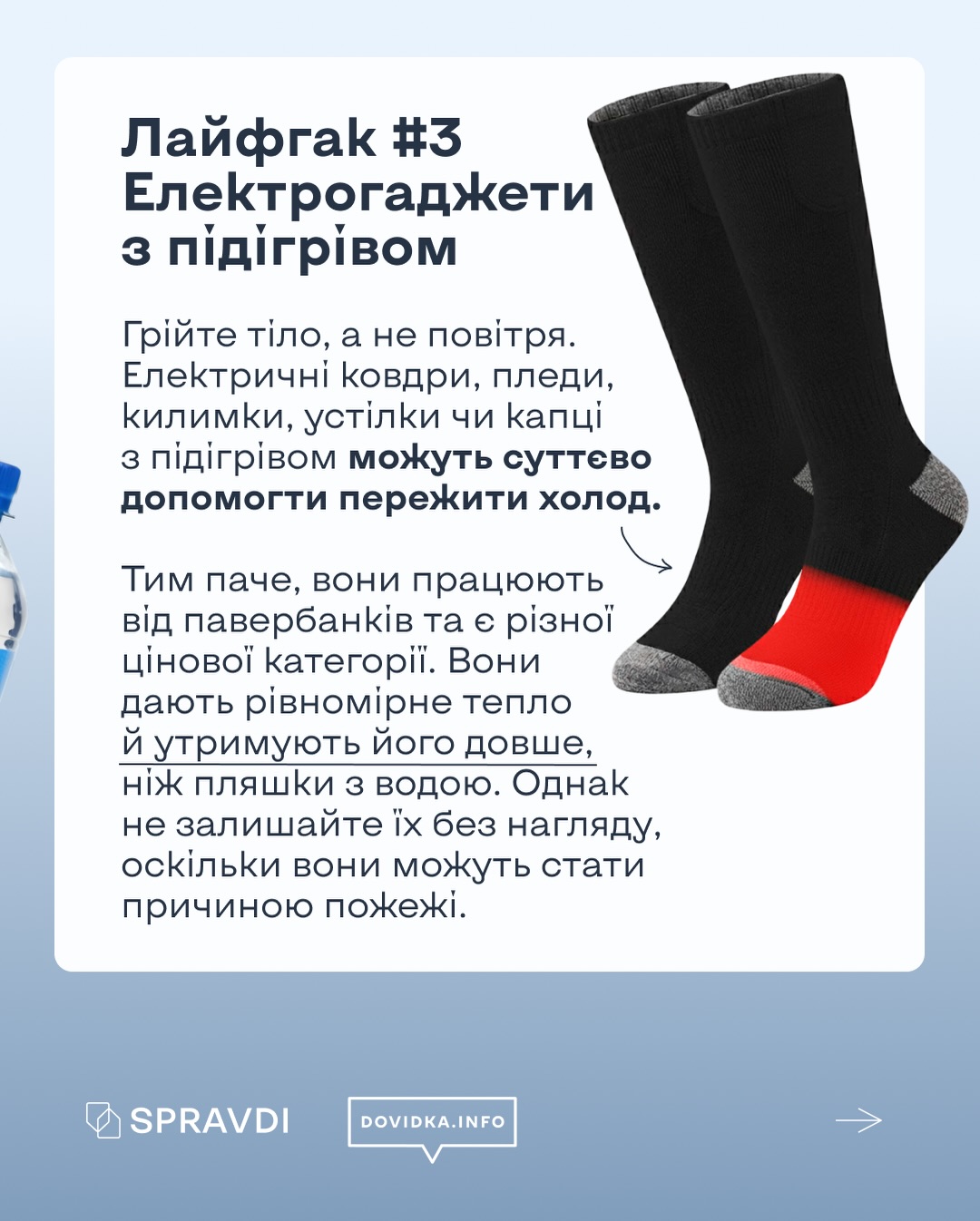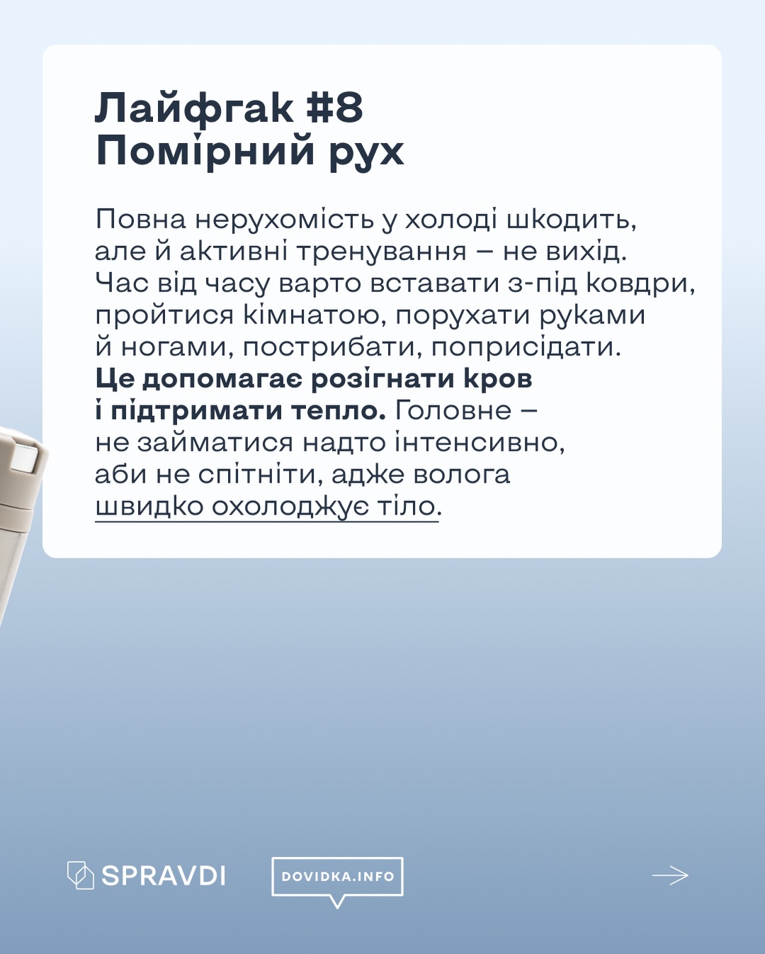 Ви можете ознайомитися з корисними лайфгаками, як зігрітися у разі відсутності опалення — усі поради зібрані на картках.