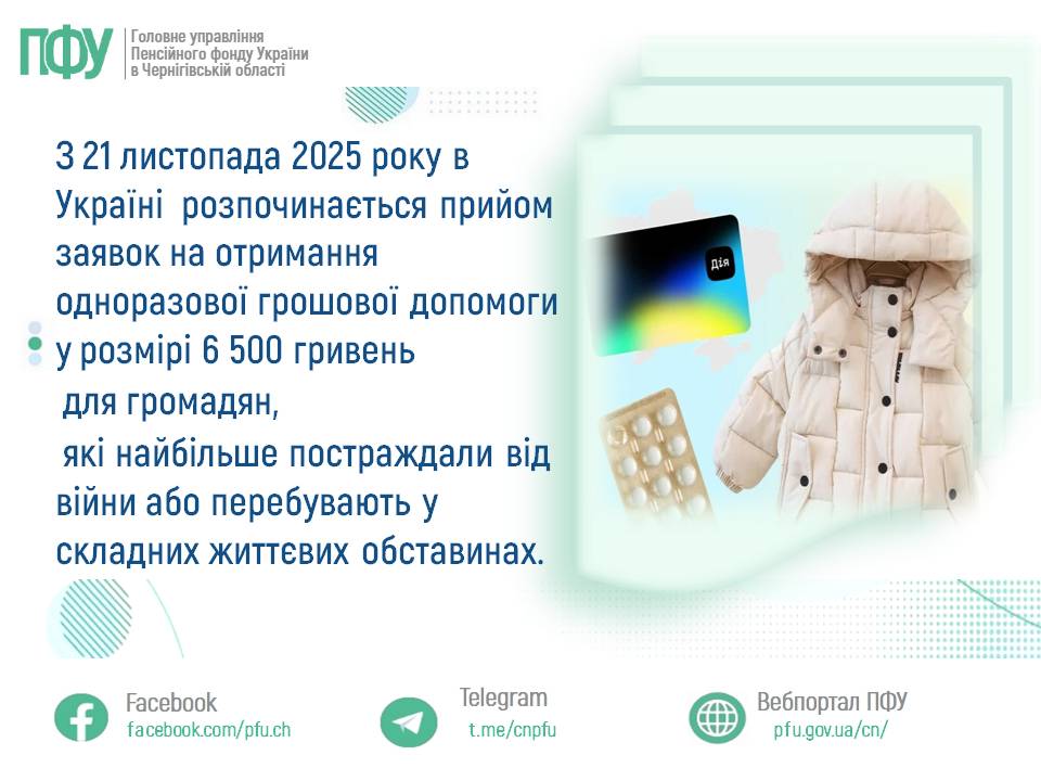 З 21 листопада 2025 року в Україні  розпочинається прийом заявок на отримання одноразової грошової допомоги у розмірі 6 500 гривень для громадян, які найбільше постраждали від війни або перебувають у складних життєвих обставинах. Програма діє в рамках Зимової підтримки.
