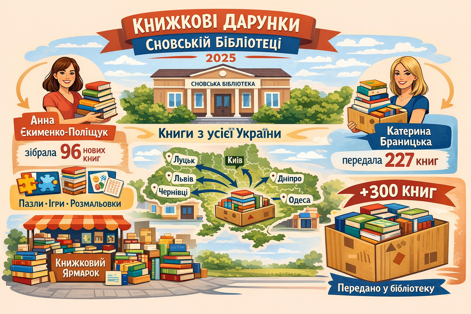 Фонд нашої бібліотеки суттєво поповнився у 2025 році сучасними українськими виданнями завдяки небайдужим людям з різних куточків країни. І тепер усе це — доступне для жителів Сновської громади