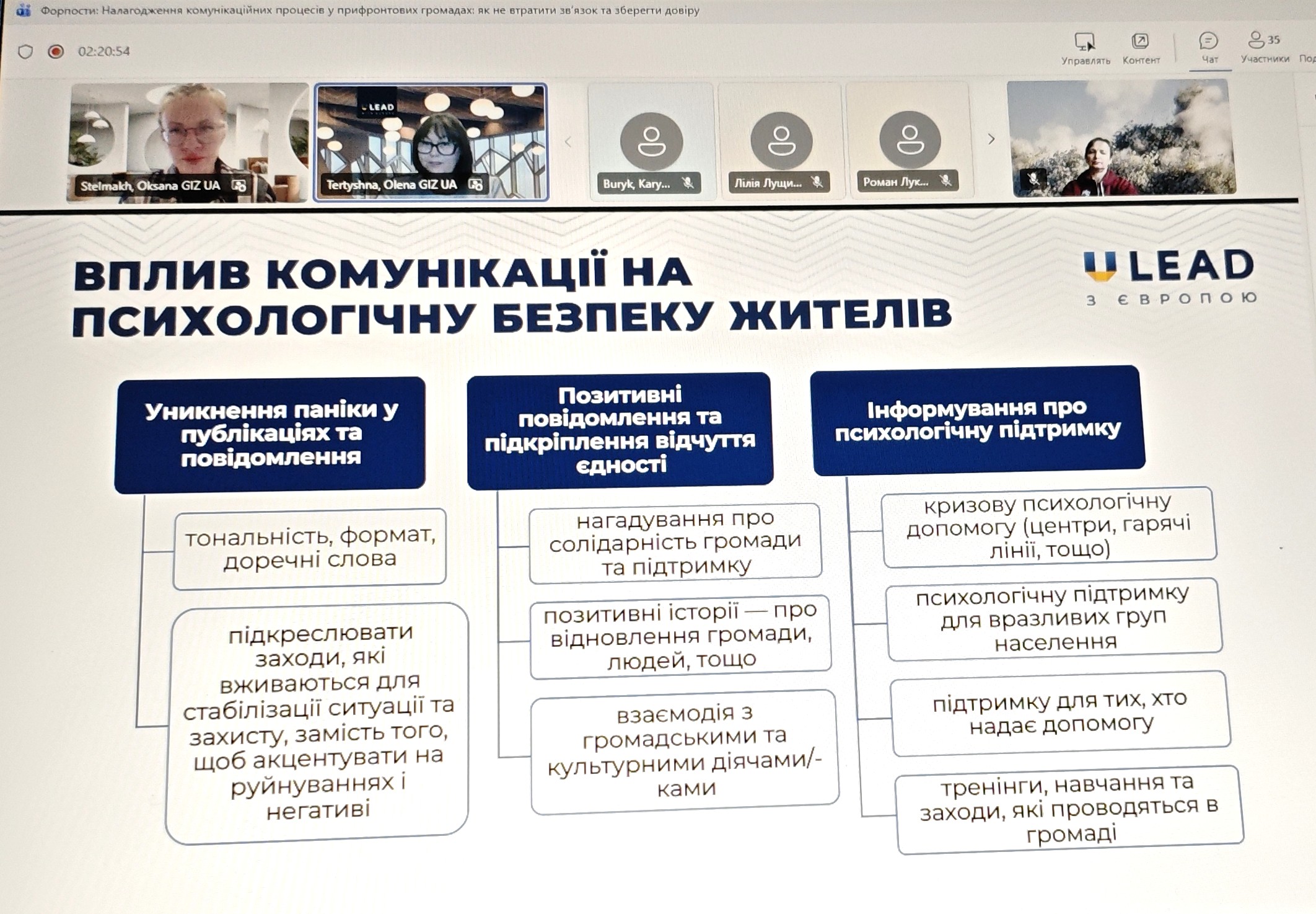 На завершальних онлайн зустрічах говорили про комунікацію в громадах в умовах загроз війни, особливості інформування жителів про безпекову ситуацію та як не втрачати довіру людей. Жителям громади варто усвідомити, що довіряти треба лише офіційним джерелам інформації та не піддвавтися на фейки та провокаційні вкиди ворога.